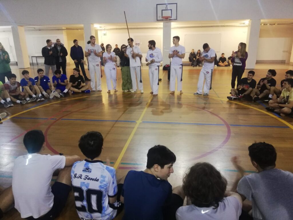 A demonstração foi promovida por vários elementos do grupo ABADÁ CAPOEIRA e teve a participação ativa dos alunos presentes.