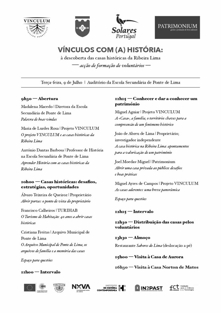 No âmbito do Projeto Vinculum, os alunos dos cursos de Línguas e Humanidades e das Artes, do Agrupamento de Escolas de Ponte de Lima (turmas 10º G, !0ºH, 10ª I; 10º J, 11º G e 11º H) em regime de voluntariado, irão participar num dos primeiros momentos deste projeto, materializado numa ação de formação a decorrer no dia 9 de julho no auditório da Escola Secundária de Ponte de Lima. Esta formação será ministrada por investigadores do Instituto de Ciências Sociais da Universidade Nova de Lisboa e por palestrantes que irão abordar as temáticas “As Casas históricas: desafios, estratégias, oportunidades” e “Conhecer e dar a conhecer um património”. Após o encerramento desta ação, os alunos serão brindados com um almoço no restaurante Sabores do Lima, seguido de duas visitas à Casa de Aurora e à Casa Norton de Matos.