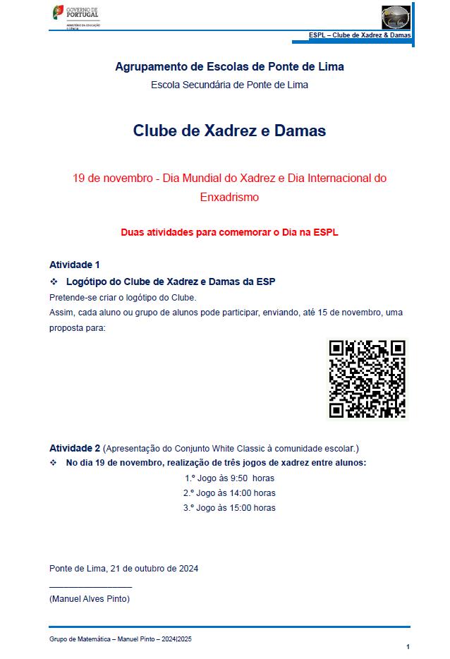 No dia 19 de novembro de 2024 e no âmbito do “Dia Mundial do Xadrez” e do “Dia Internacional do Enxadrismo”, o Clube de Xadrez e Damas da ESPL promoverá as seguintes atividades: