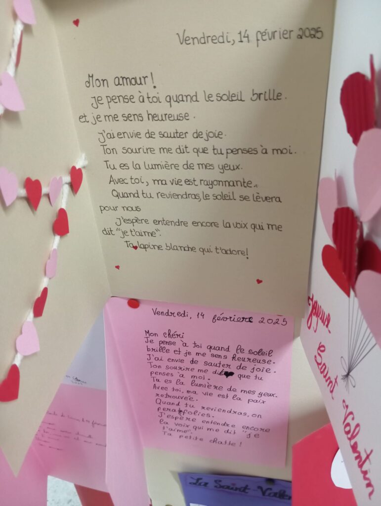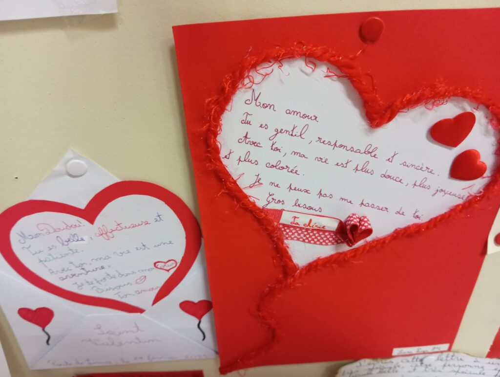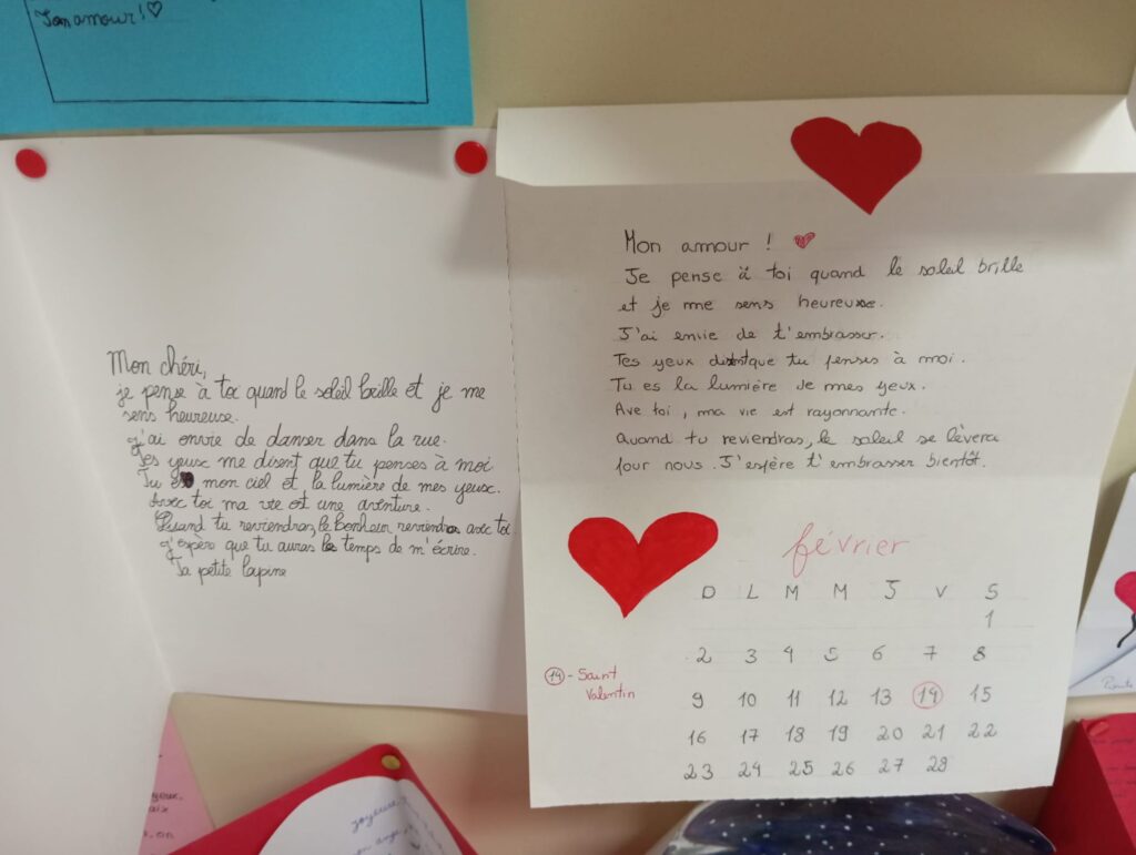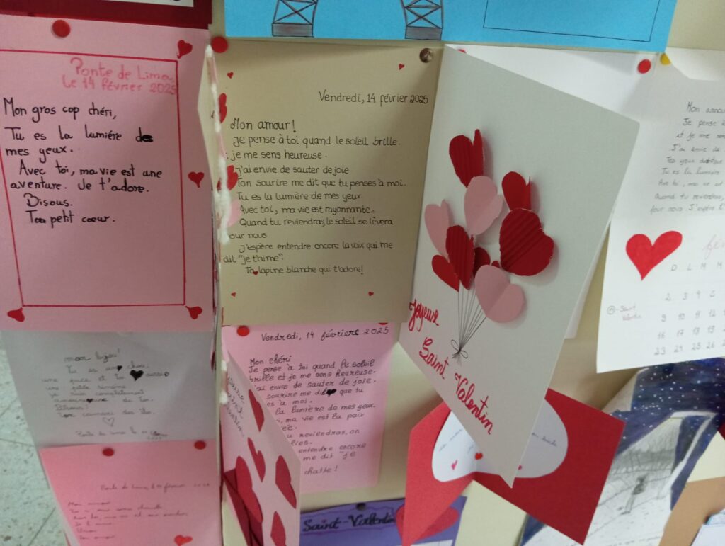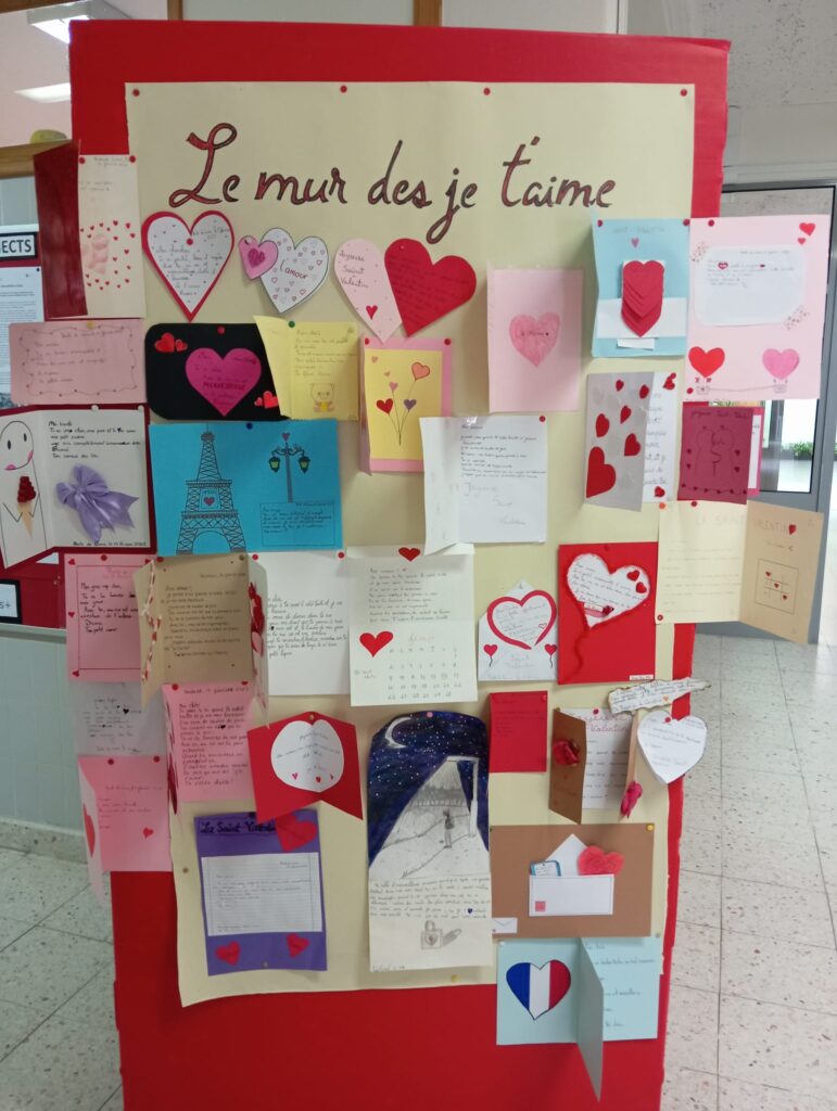 Os alunos que aprendem Francês (níveis A1 e A2) trabalharam com afinco para edificar o original “Mur des Je t’aime”, mobilizando vocabulário muito próprio daquela que é considerada “a língua do Amor” e refletindo, assim, sobre o facto de que se pode contrariar a ideia de que um muro serve apenas para dividir, separar e/ou proteger-se do Outro.