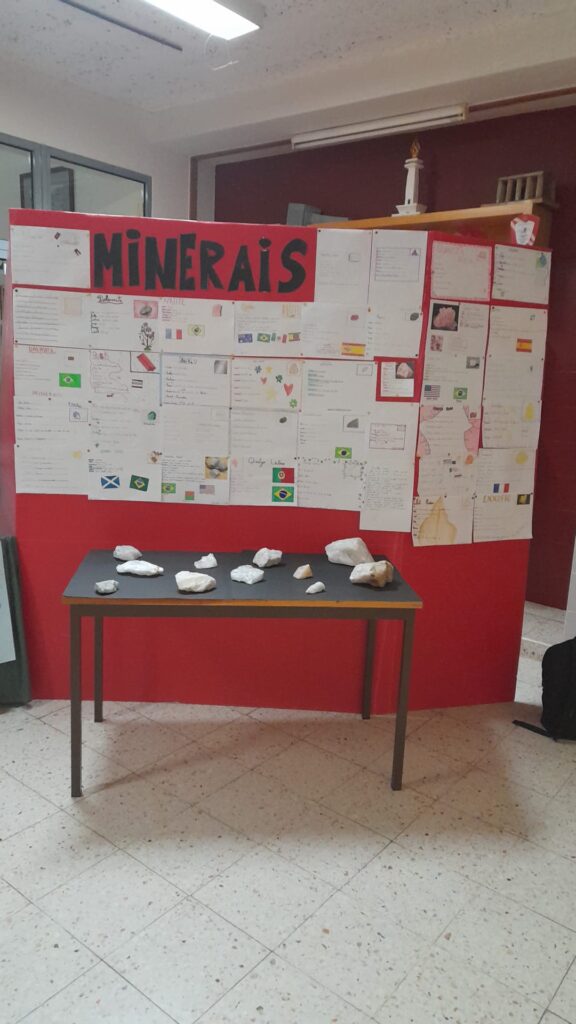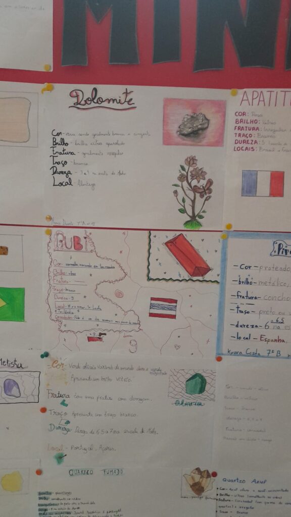 Estão também expostos trabalhos realizados pelos alunos do 7°ano, sobre vários minerais. Também foram expostos alguns exemplares de minerais.