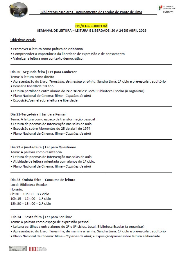 Sob o tema “Ler para ser livre”, pretende-se destacar a importância dos livros como ferramentas de conhecimento, imaginação e liberdade. Ler permite-nos viajar, questionar, aprender e crescer enquanto cidadãos mais conscientes e autónomos.
